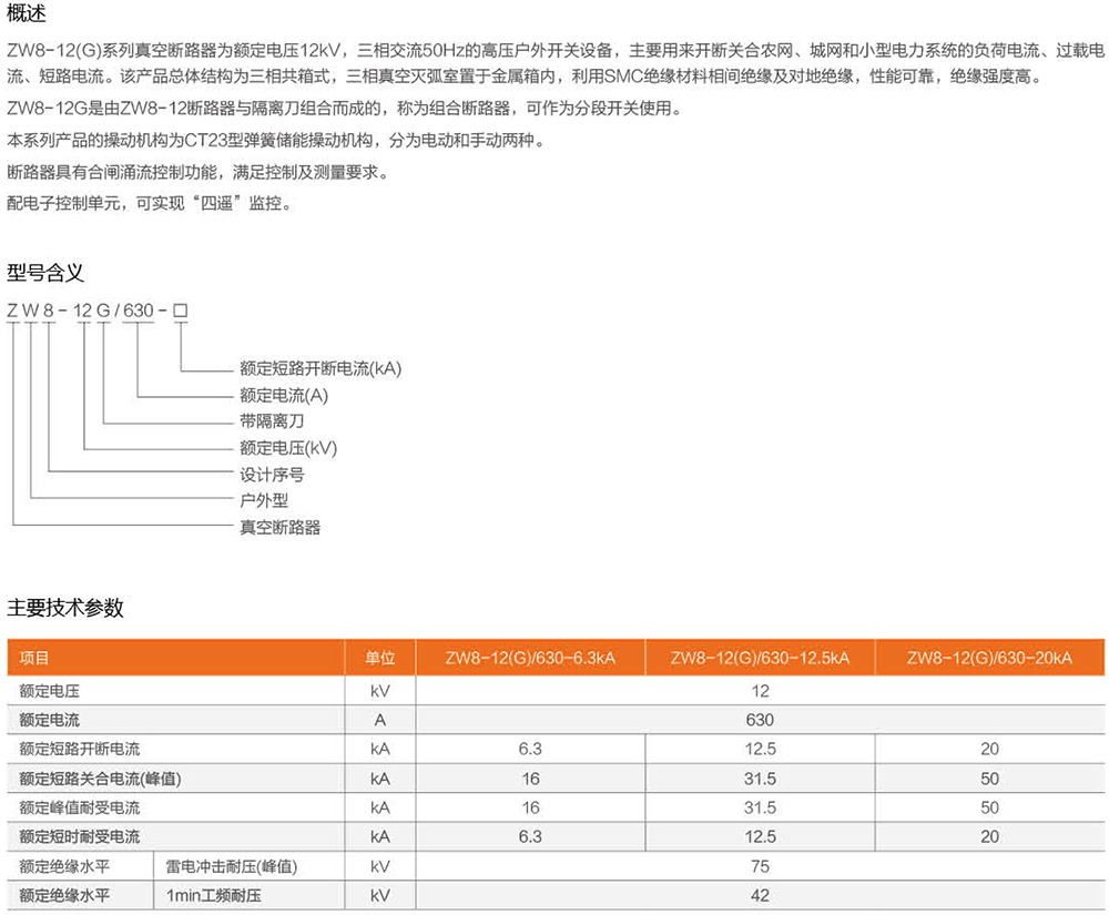 ZW8- 12(G)系列真空断路器为额定电压12kV,三相交流50Hz的高压户外开关设备,主要用来开断关合农网、城网和小型电力系统的负荷电流、过载电流、短路电流。该产品总体结构为三相共箱式,三相真空灭弧室置于金属箱内,利用SMC绝缘材料相间绝缘及对地绝缘,性能可靠,绝缘强度高。