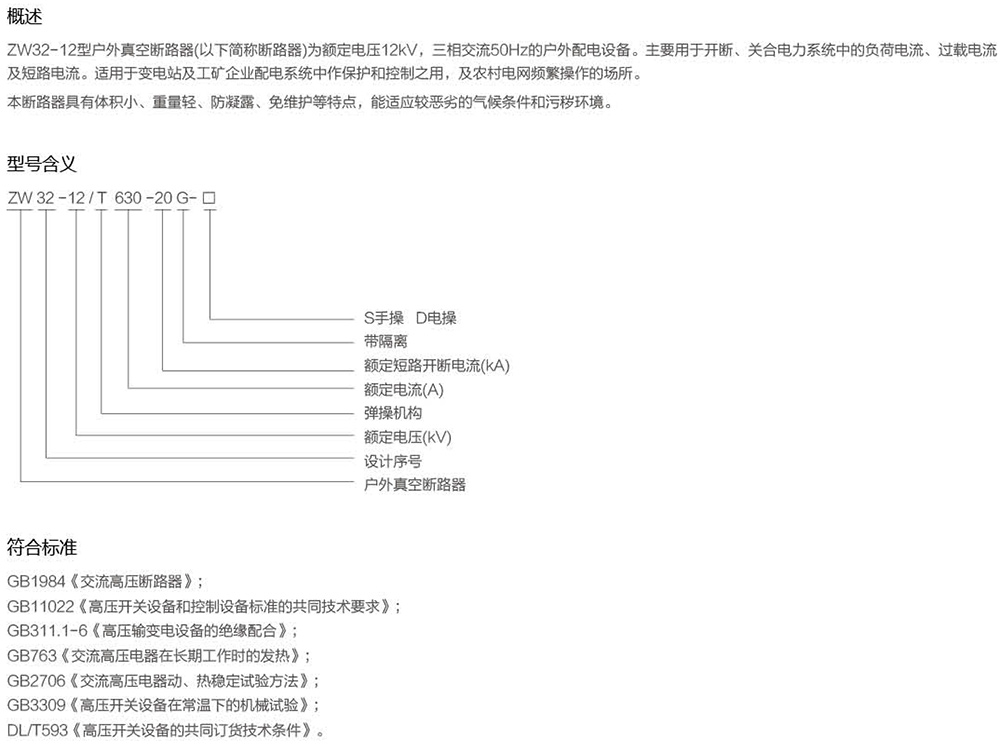 ZW32-12型户外真空断路器(以下简称断路器)为额定电压12kV,三相交流50Hz的户外配电设备。主要用于开断、关合电力系统中的负荷电流、过载电流及短路电流。适用于变电站及工矿企业配电系统中作保护和控制之用,及农村电网频繁操作的场所。