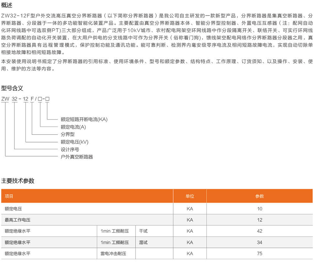 ZW32-12F型户外交流高压真空分界断路器(以下简称分界断路器)是我公司自主研发的一款新型产品,分界断路器是集真空断路器、分界断路器、分段器于- -体的多功能智能化装置产品。主要配置由真空分界断路器本体、智能分界型控制器、外置电压互感器(注:配网自动化环网线路中可选双侧PT)三大部分组成,产品广泛用于10kV城市、农村配电网架空环网线路中作分段隔离开关、联络开关、可实行环网线路负荷调配的自动化开关装置,在大用户供电的分支线路中可作为分界开关(俗称看门狗),馈线架空配电网络作分界断路器分段器之用,真空分界断路器具有远程管理模式,保护控制功能及通讯功能。能可靠判断、检测界内毫安级零序电流及相间短路故障电流,实现自动切除单相接地故障和相间短路故障。